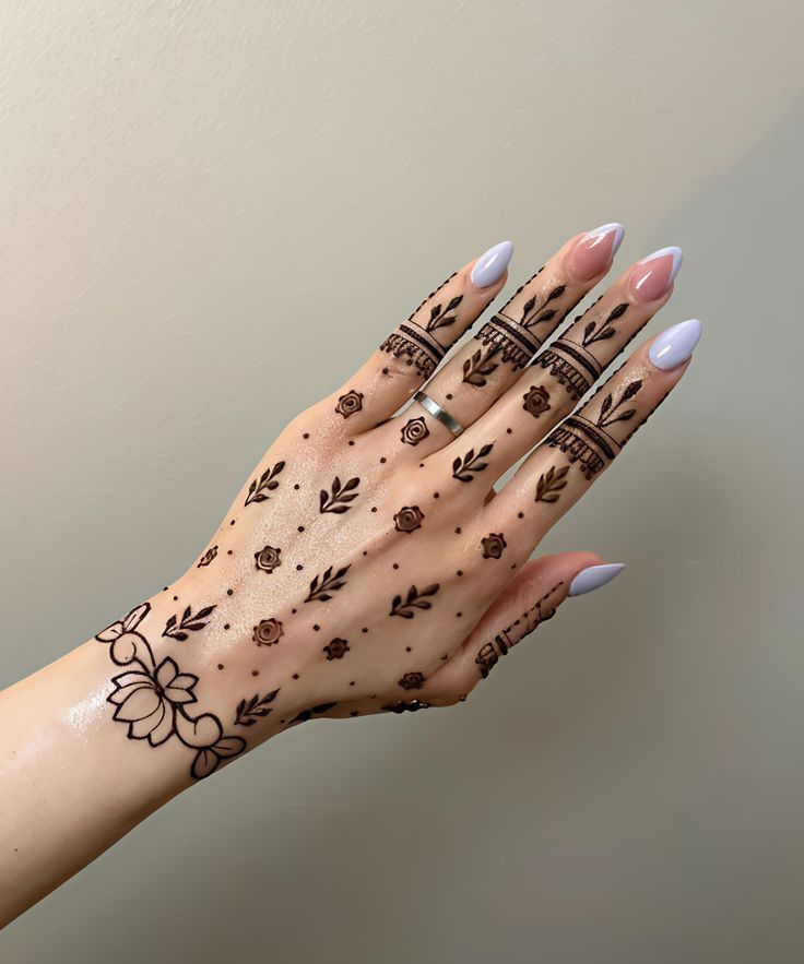 These traditional elements are combined to create elaborate and captivating visuals that can cover the entire back of the hand. The complexity of these designs is a testament to the artistry of mehandi. Despite their detail, they can also be adapted to showcase a beautiful sense of simplicity.