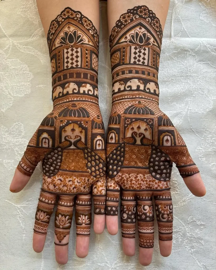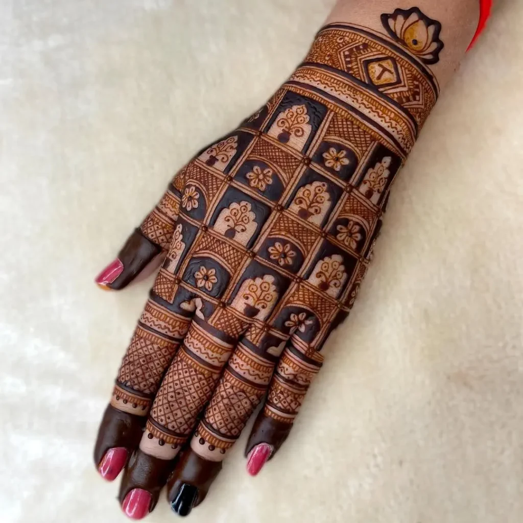 For brides wanting classic elegance with a modern twist, the checkered pattern mehndi is a great option. Imagine beautiful grids on your hands, mixed with detailed flower patterns or traditional Indian designs. The bold checks and delicate henna art can create a stunning visual effect like a 3D pattern.