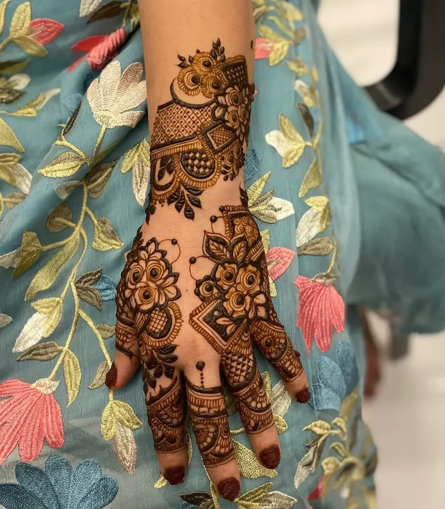 Floral mehndi with a checks design mixes pretty flower patterns with neat geometric checks. This creates a beautiful blend. This design gives a fresh twist to traditional mehndi styles, making it great for anyone looking for a unique and fashionable look. The soft mix of petals and structured checks brings richness and grace to the overall art. It’s a lovely choice for many events, like weddings or festivities. Try this modern style of mehndi art to decorate your hands with a mix of flower beauty and geometric style.