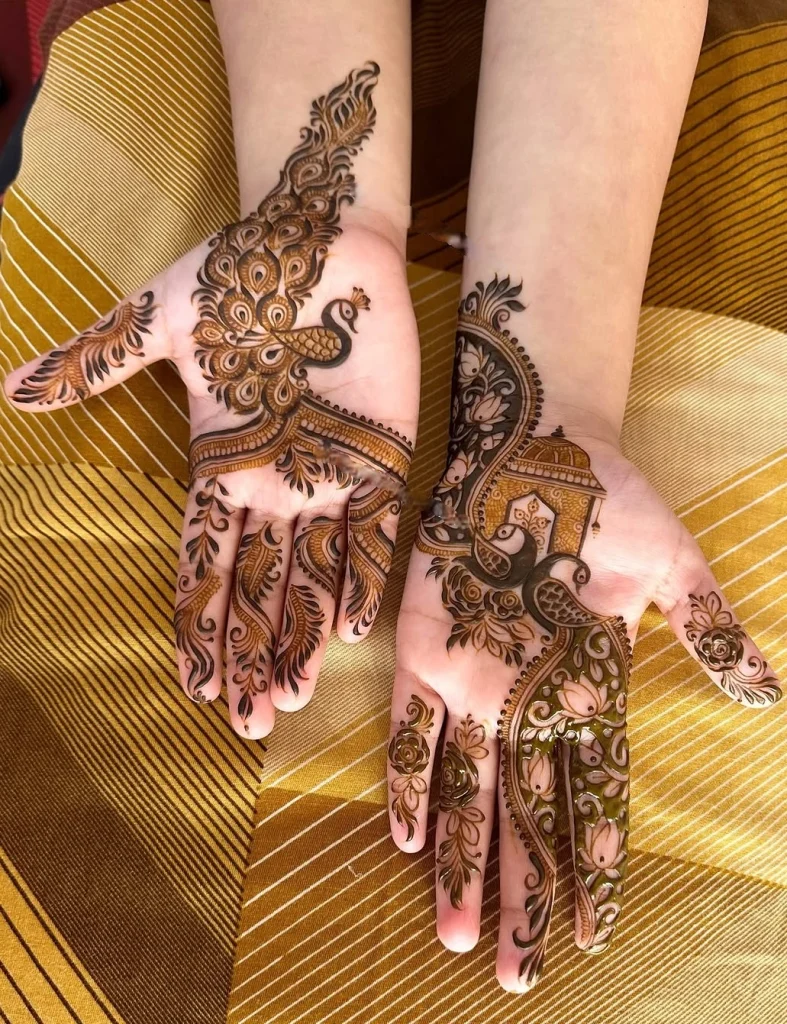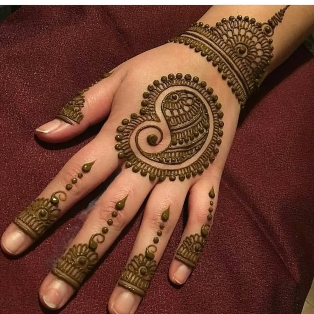 Intricate designs of peacock feathers are great for festive occasions. These mehndi designs show beauty, grace, and elegance. They are popular for special events like weddings and traditional ceremonies. The detailed peacock feathers use floral motifs and swirls, making any bridal look or outfit more special. Using these designs on the back of the hand or as finger mehndi designs can enhance your style and help you stand out at any event.