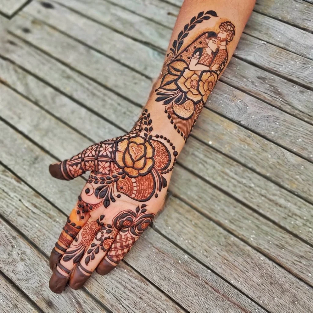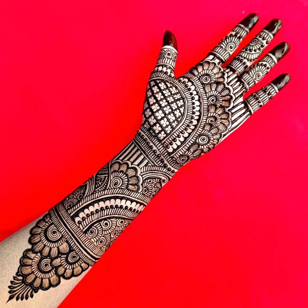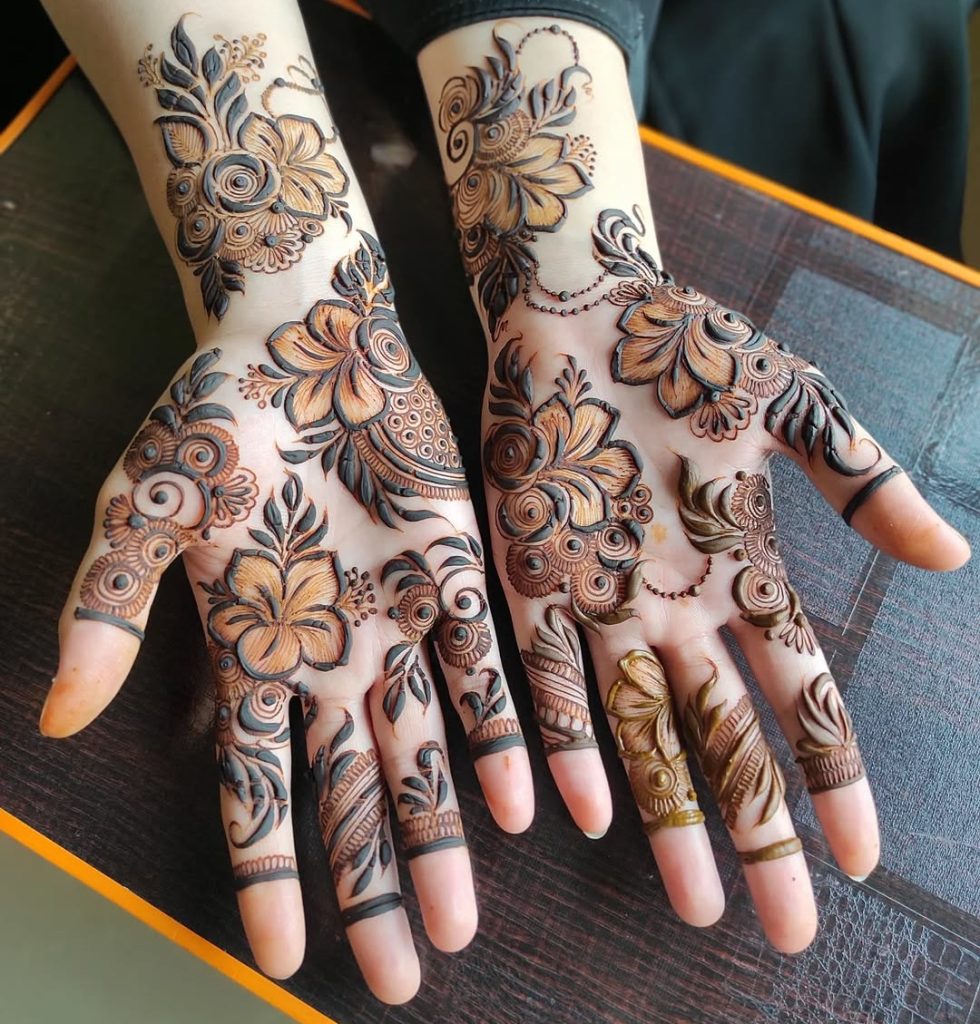 Elegant floral patterns add grace and charm to bridal mehndi. They enhance the bride’s hands, bringing a touch of nature’s beauty. These intricate designs feature delicate floral and leaf motifs and graceful swirls. They perfectly match the bridal look and add sophistication to the overall appearance. Floral mehndi designs can flow down the arms or decorate the back of the hand. This creates a mesmerizing effect. They fit well with bridal outfits and jewelry, making the bride look radiant on her special day.