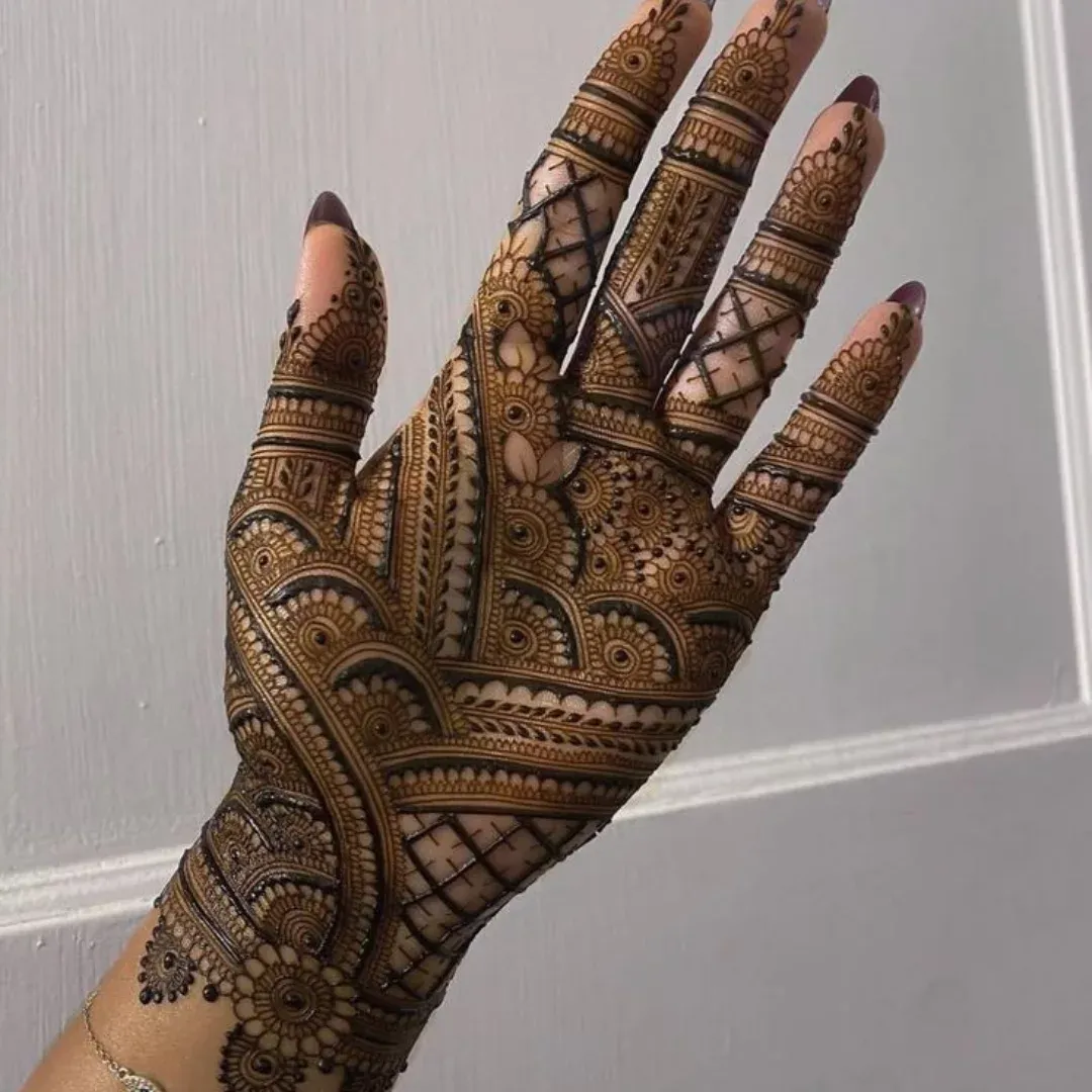 Explore the charm of modern geometric mehndi. It’s great for those who love contemporary styles. These designs mix clean lines and abstract shapes for a unique and stylish look. Geometric patterns add a classy touch to your mehndi, making you feel trendy. From triangles to squares, these designs are flexible and fit for any occasion, whether you’re going out casually or dressing up for a formal event. Enjoy the blend of tradition and modern style with elegant geometric mehndi patterns. Enhance your mehndi with these stylish and trendy designs.
