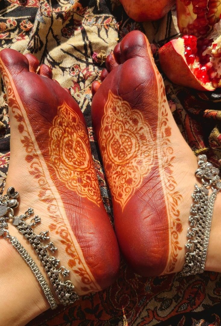 Mehndi put on the feet is a special tradition in many cultures. People believe it shows beauty and brings good luck and positive vibes. Designs such as mandala mehndi and bridal patterns are very popular. These often tell deeper stories or have hidden meanings. Henna color can be different on every person, depending on their skin type. This makes the look of mehndi feel unique and adds a touch of elegance for each one.