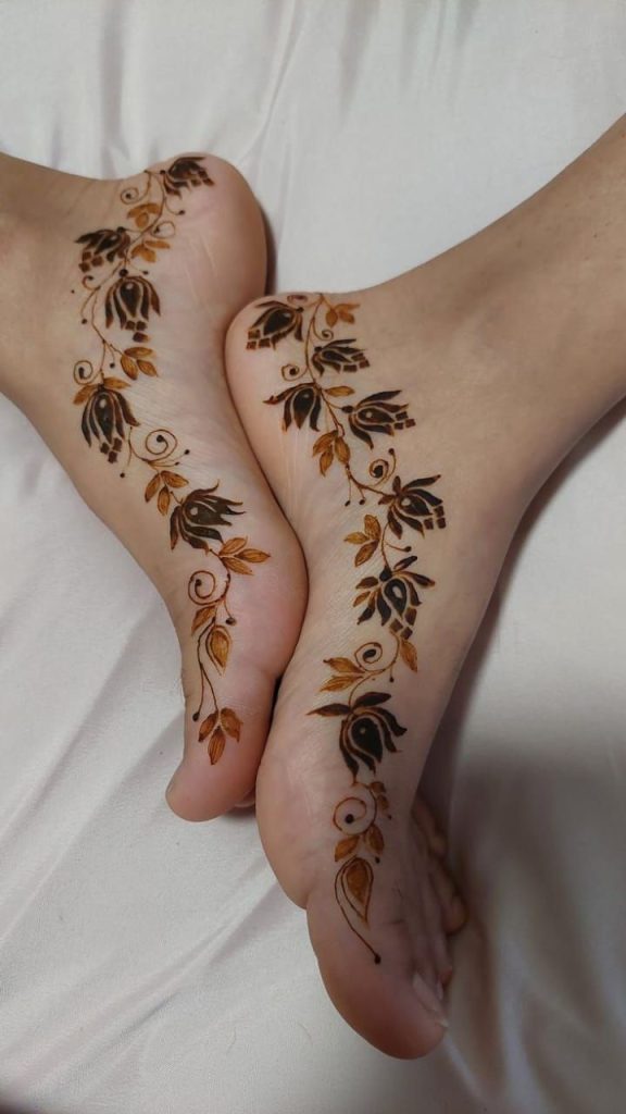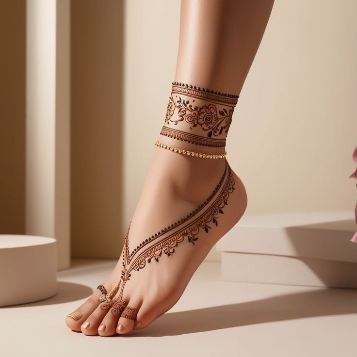 You can pick from shapes like twisting vines or small neat lines. This trend brings a soft touch of elegance and keeps things modern. You can wear these feet mehndi designs with your anklets or even by themselves. Anklet-inspired mehndi gives your feet that effortless beauty, fitting for any time.