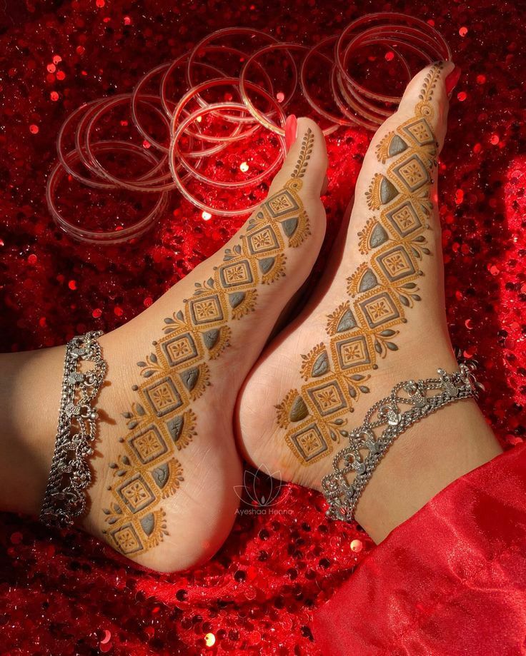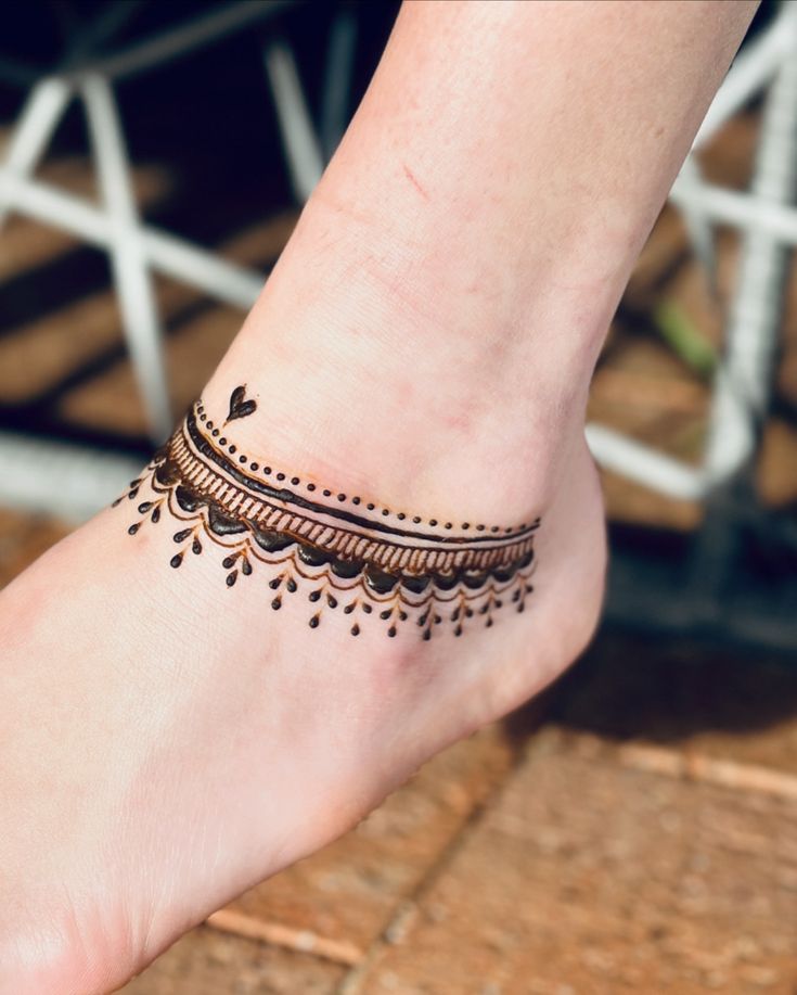If you love a simple and pretty style, feet mehndi that look like anklets can give you a nice new look. These mehndi designs copy the look of real jewelry and wrap around the ankle. Some of these patterns can go onto the toes, too, which gives your feet some extra charm.