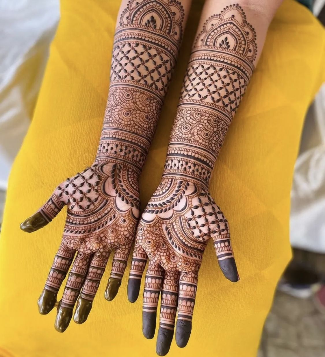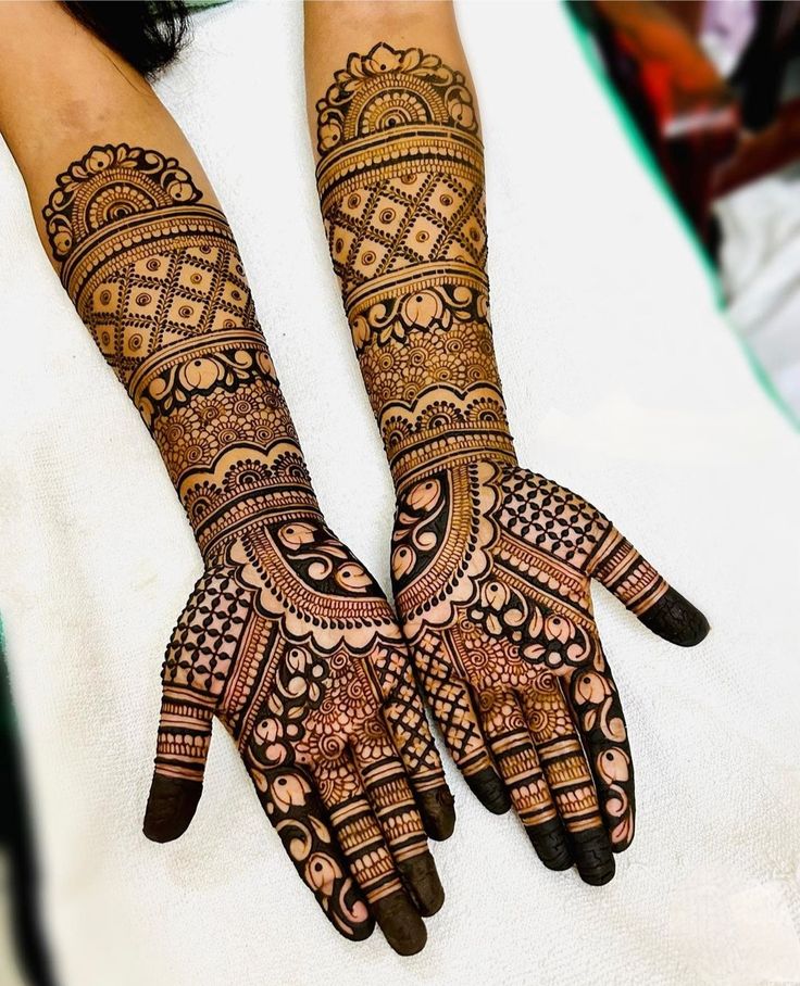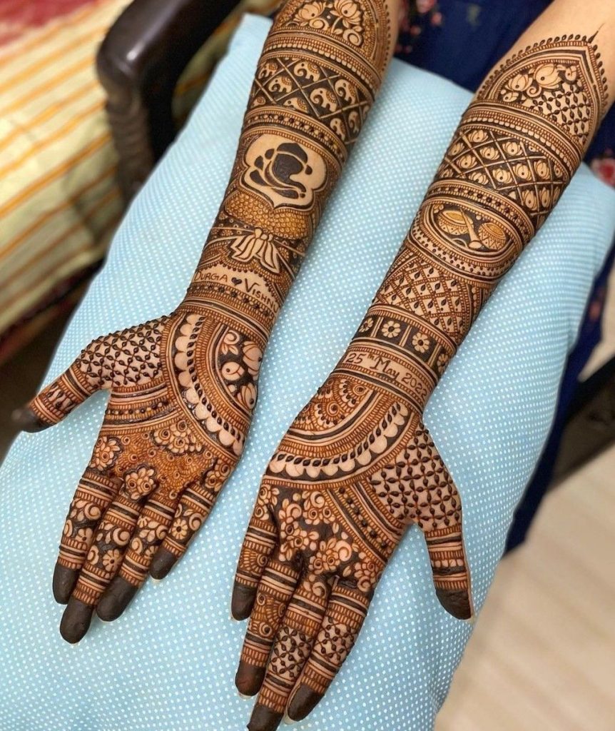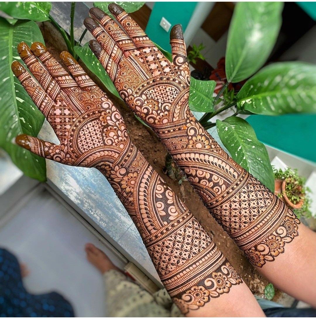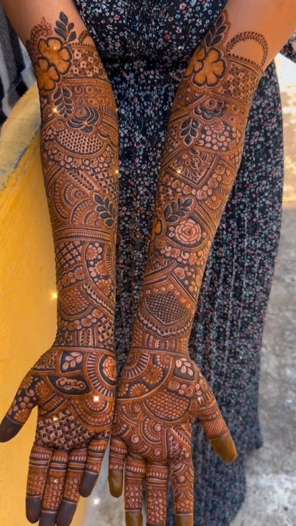 Trending styles now show a lot of hand mehndi with geometric shapes, mandalas, and lotus motifs. Many people like Arabic designs with bold outlines and strokes that match on each side. Royal full hand mehndi with intricate details is getting more attention because of its elegance and the way it shows culture.