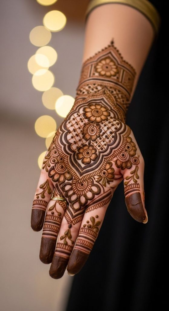 For a graceful touch, many women pair mandala patterns with decorative finger mehndi designs or a delicate wristband. This makes the design look more complete and adds a layer of sophistication. It’s an excellent choice that feels both traditional and modern.