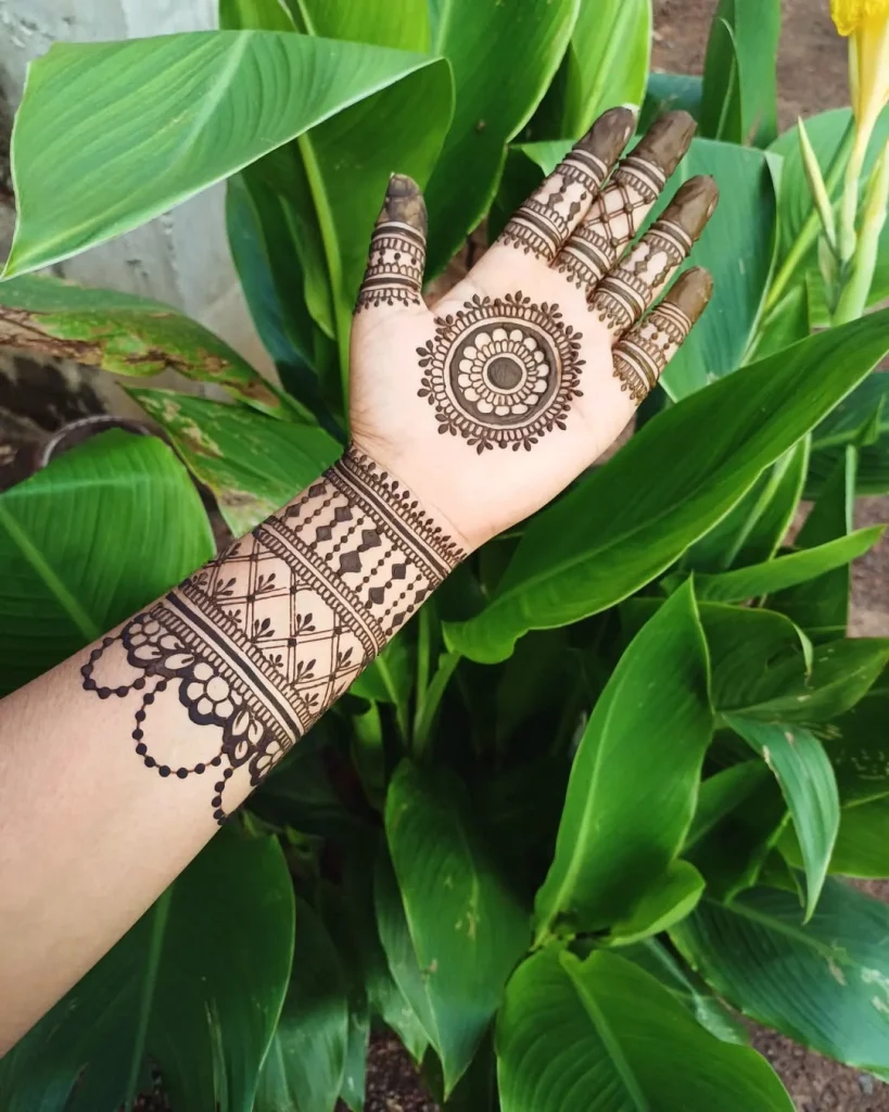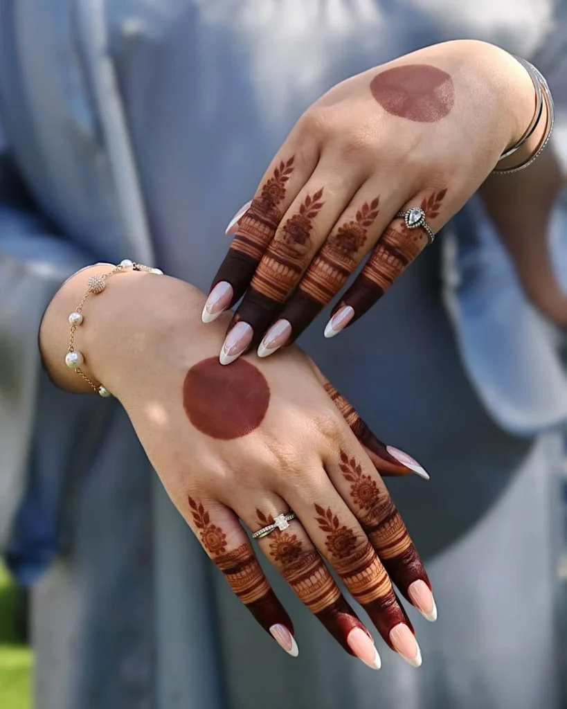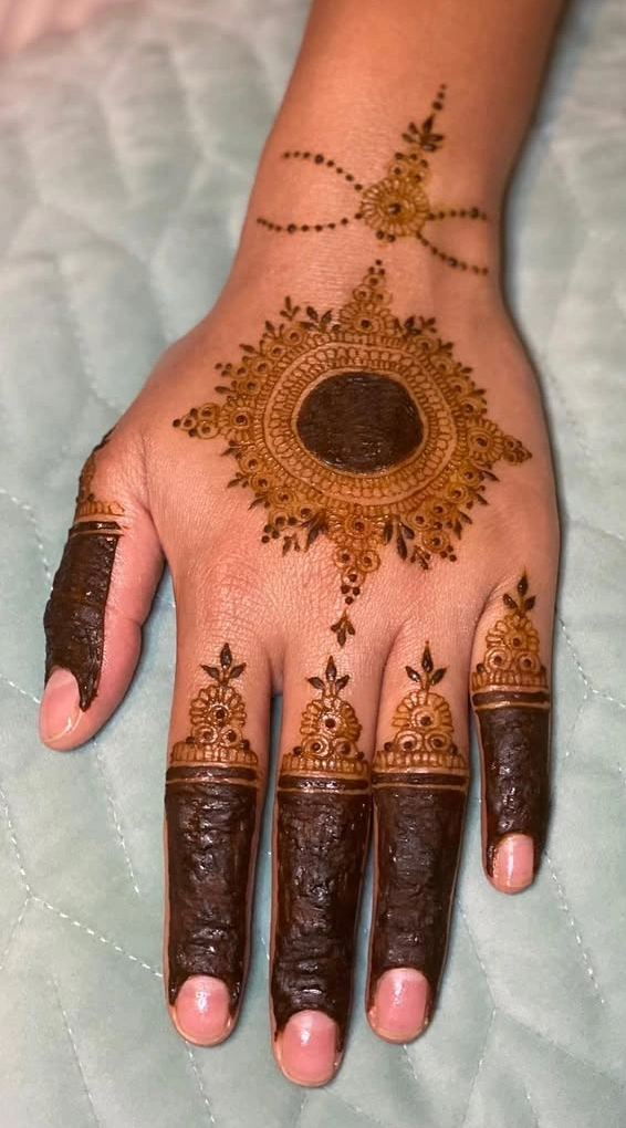 Are you interested in mehndi designs that are lovely and easy to make? Simple Gol Tikki mehndi is a great option. This design has a perfect circle in the center of the palm. It is surrounded by patterns that are both detailed and simple. It blends tradition with practicality, taking little time and effort.
