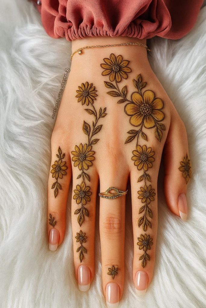 - Simple Floral Trail: A small flower on the back of the hand with a delicate vine trailing down a finger.