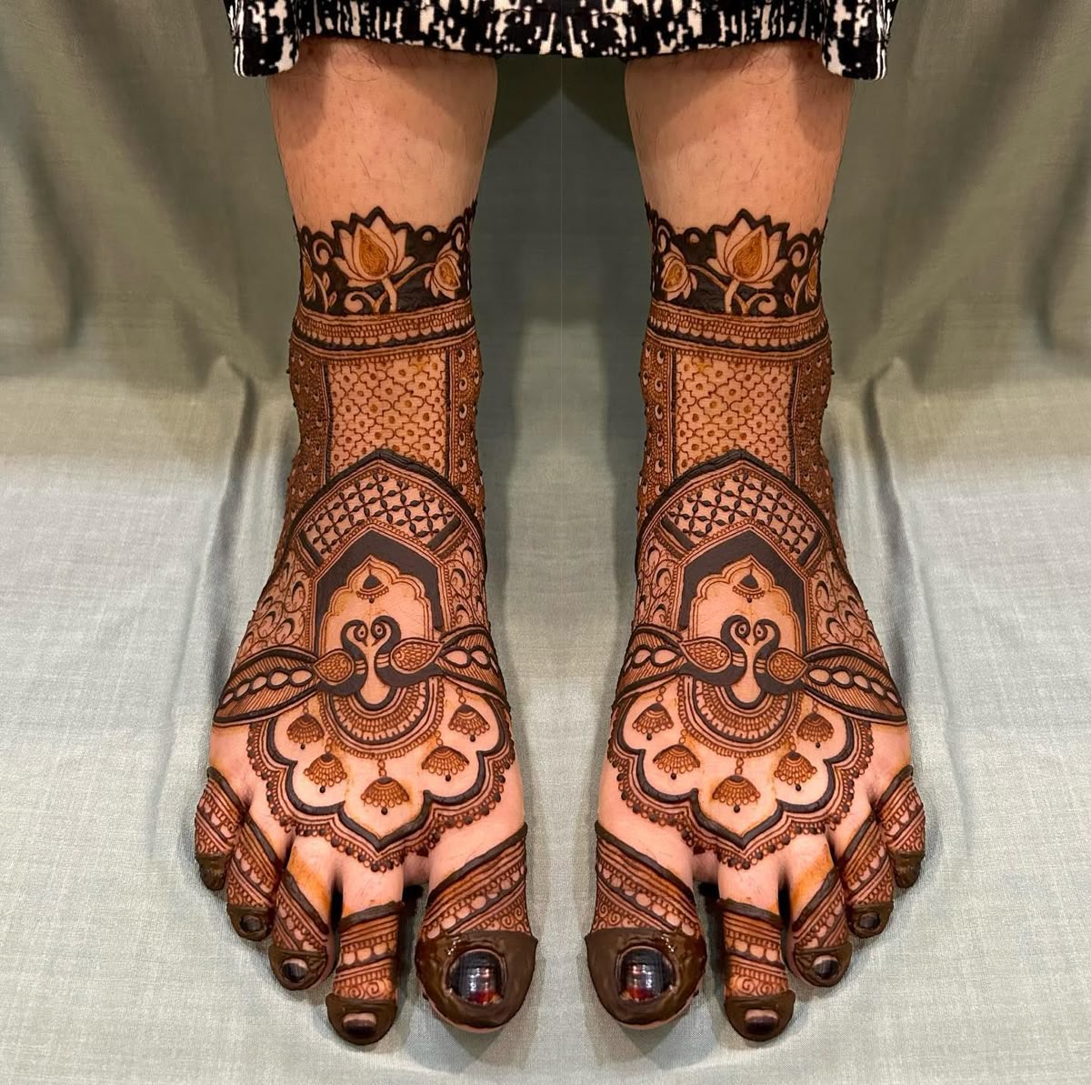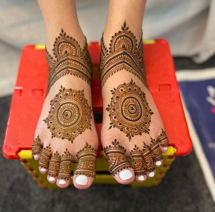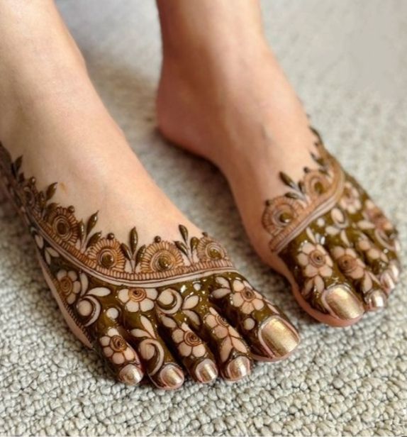 Whether you opt for a full floral pattern or a simple half-foot design, the enchanting beauty of flowers is undeniable. The delicate leaves on the toes paired with a round mehndi motif at the center embodies grace and tradition.