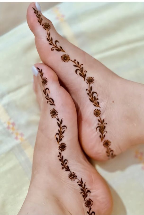 For easy home application, try simple mehndi designs like a single floral vine, minimalist patterns with fine lines, or a delicate design that mimics an anklet using dots and beads. These mehendi styles are quick to create and add a touch of simple elegance to your feet.