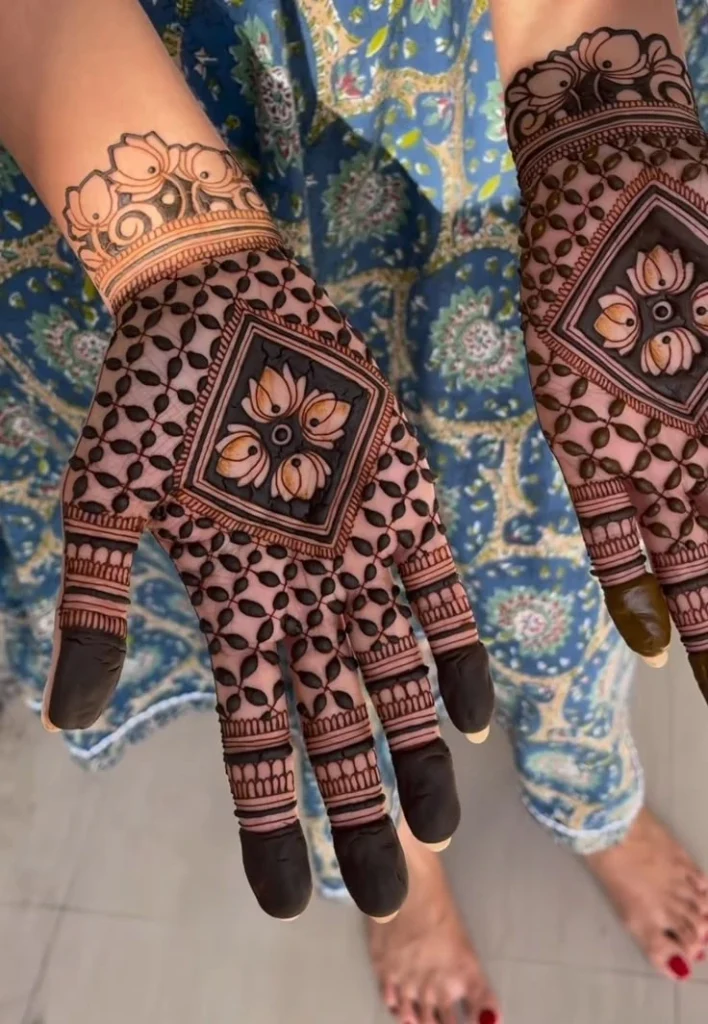 This season, mehndi designs are focusing on trendy patterns. You will see mandala lotus art on palms, geometric borders with lotus touches, and full-hand designs that include detailed flowers. Simple lotus shapes are still popular for a casual look. They are great for weddings or any casual event!