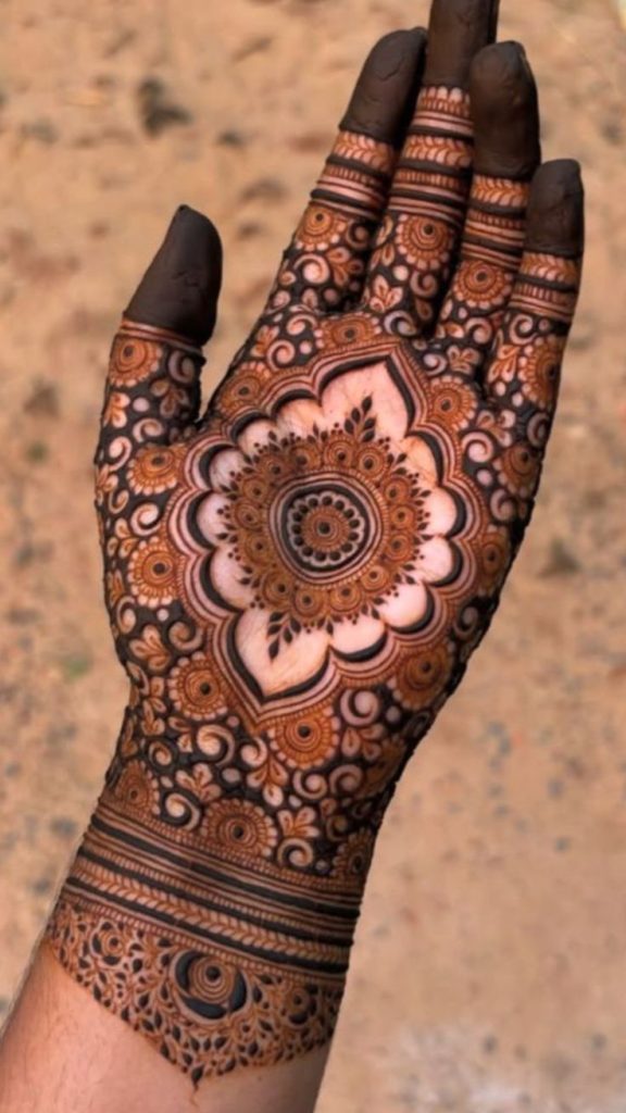 For an easy minimalist mehendi design for your hands, the central mandala is a fantastic option. It’s impactful on its own and doesn’t require complex patterns on the fingers or wrist, making it a simple yet stunning choice.