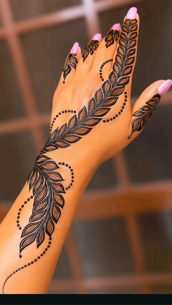 You can create an artistic mix of swirls and vines for a basic pattern that looks intricate but is simple to execute. Start a delicate stem from your wrist and have it wind its way toward a fingertip, adding small leaves along the way. These henna designs are incredibly versatile and can be as minimal or as detailed as you like.