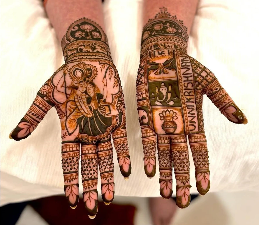 Full hand mehndi designs can include beautiful scenes from their love story, like the Raas Leela or their union under the Kadamba tree. The bride’s hands become a way to tell a story about love, devotion, and being together. This sets a positive tone for her new life.