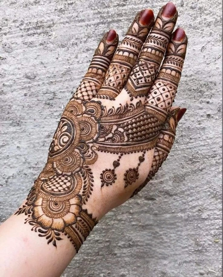 These designs can be simple and small or large and detailed, covering the whole palm. They can be used for many events. The thin lines, detailed motifs, and balanced patterns create a lovely design that shows both charm and spiritual significance.