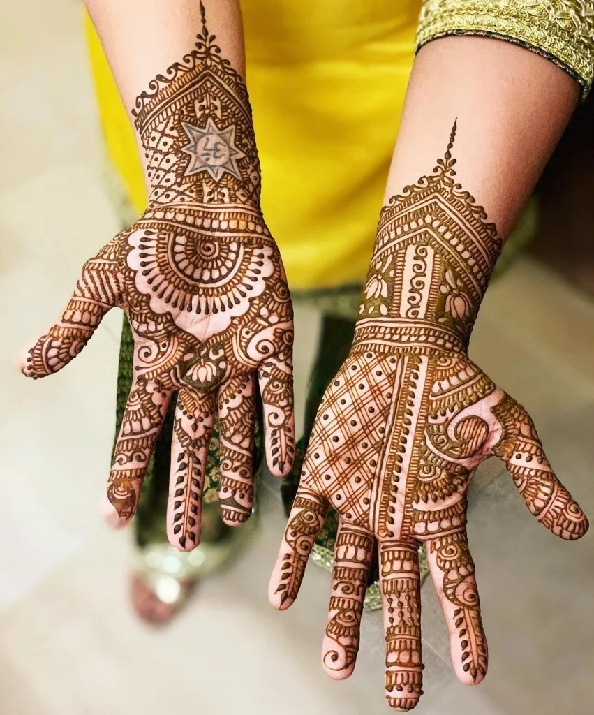 Rajasthani mehndi designs often show circles, complex patterns, and fine floral or paisley motifs starting from the center. The round shape of the mandala represents completeness, togetherness, and the natural cycle of life. This is why it’s common for bridal mehndi.
