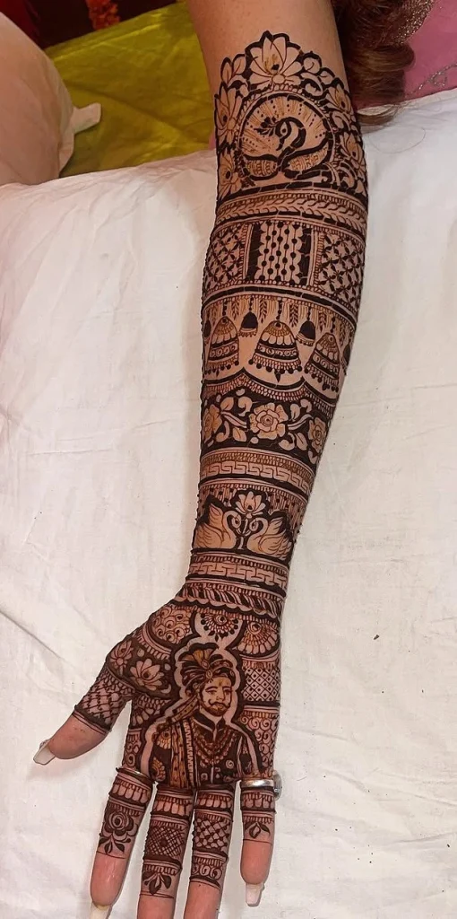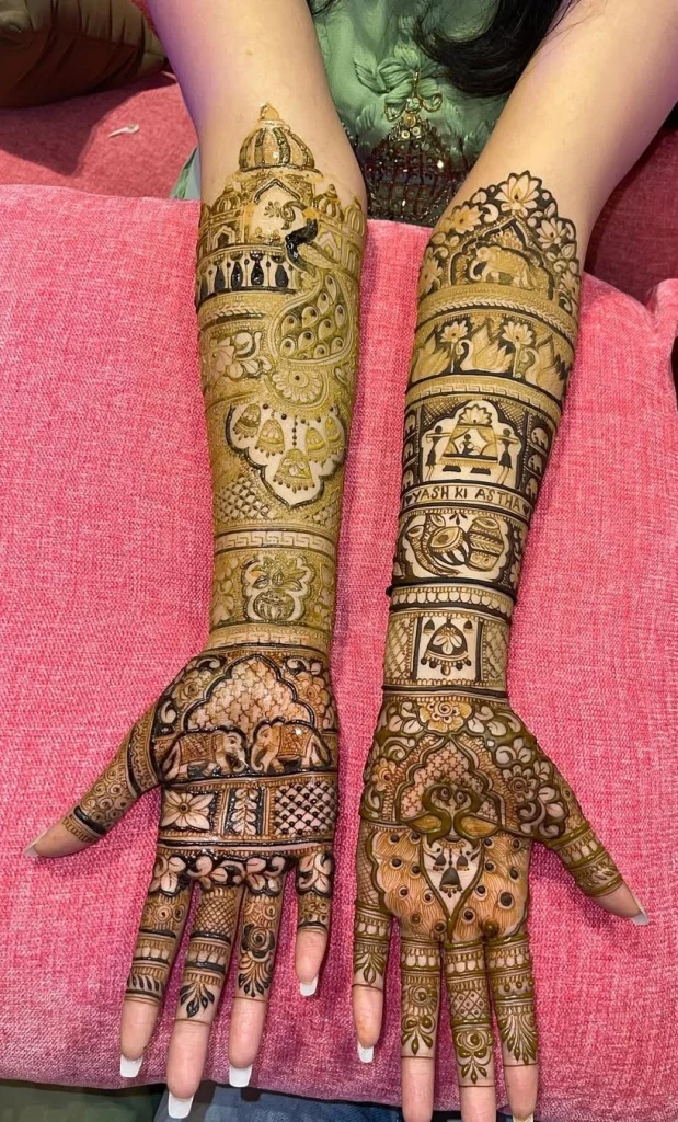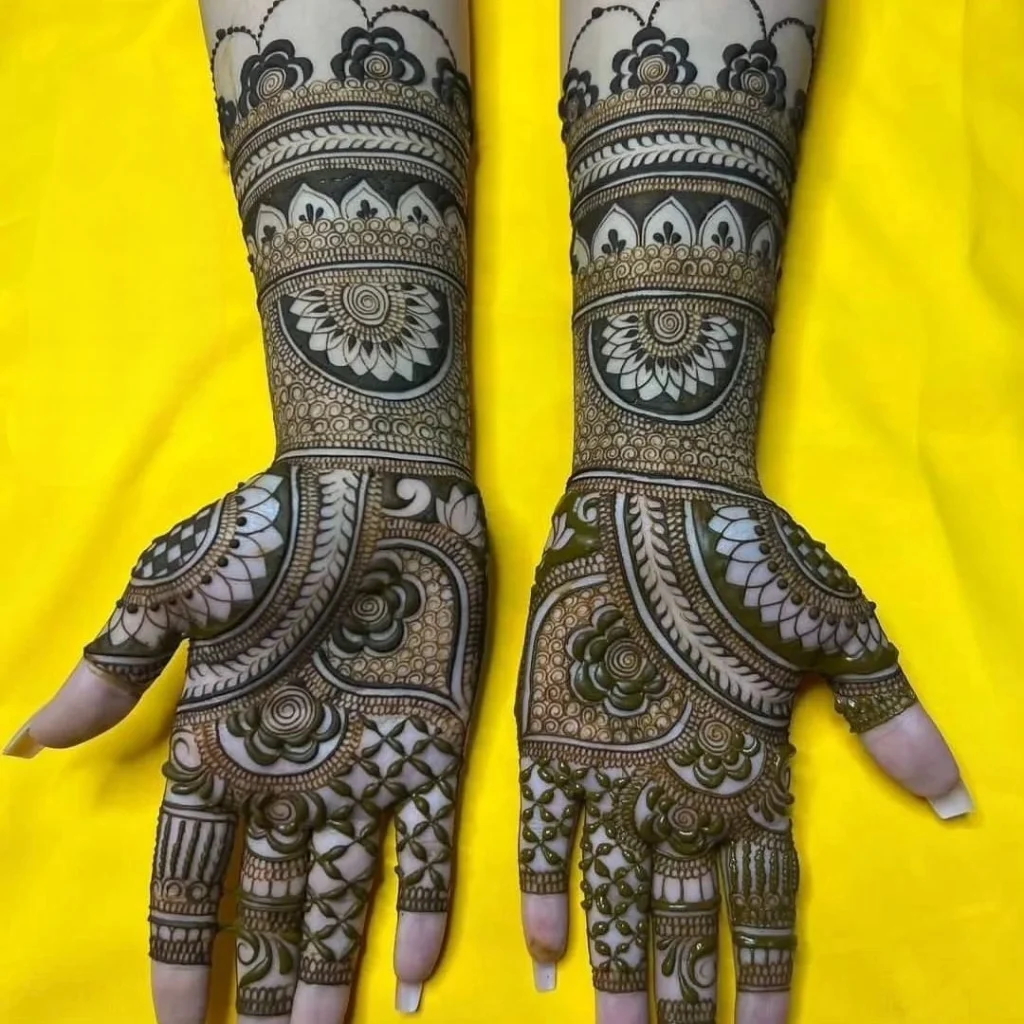 In the detailed mehndi designs, these traditional motifs come together to make beautiful patterns for hands and feet. The careful work and precision used show the talent of Rajasthani mehndi artists.