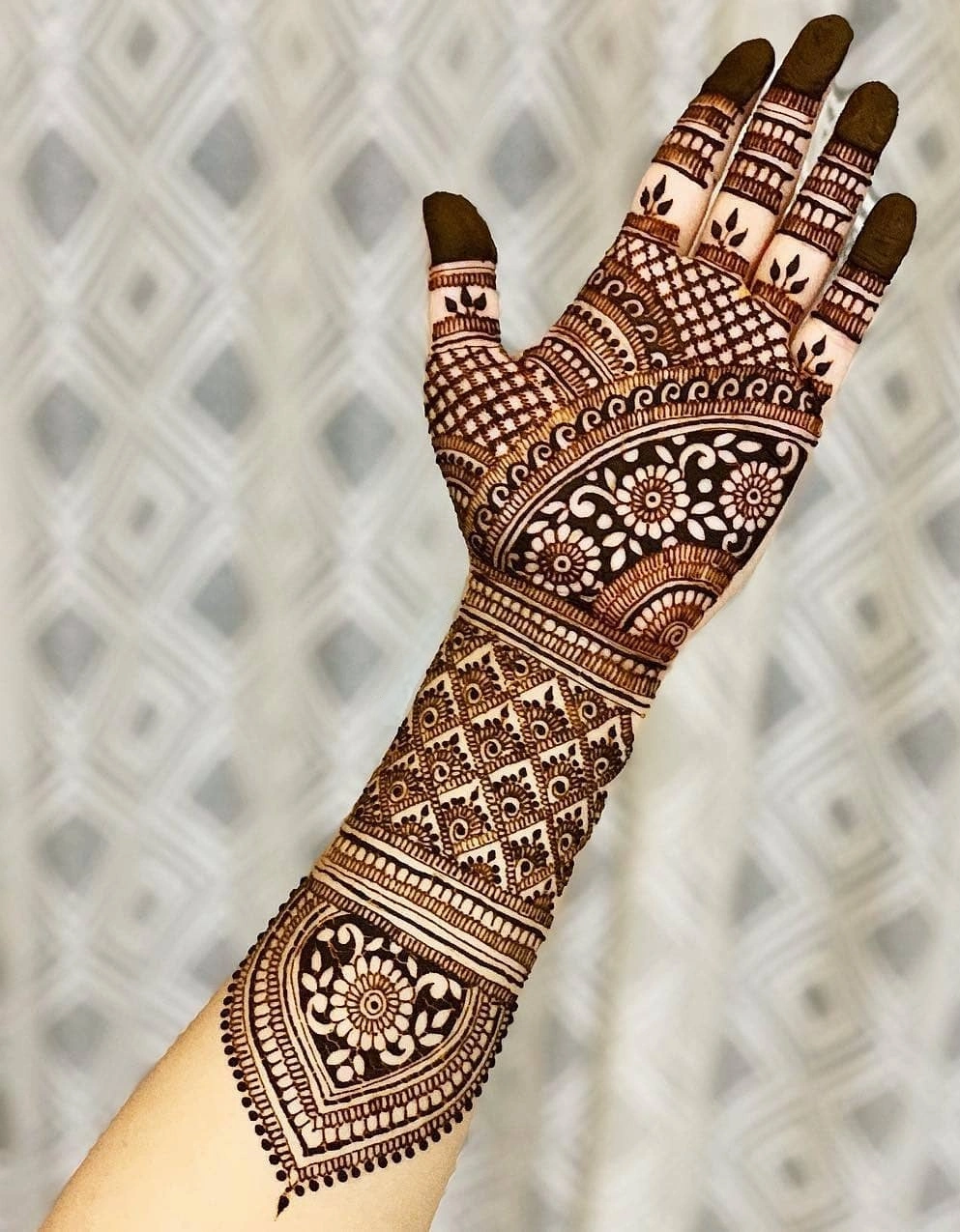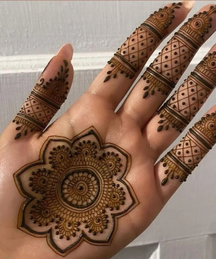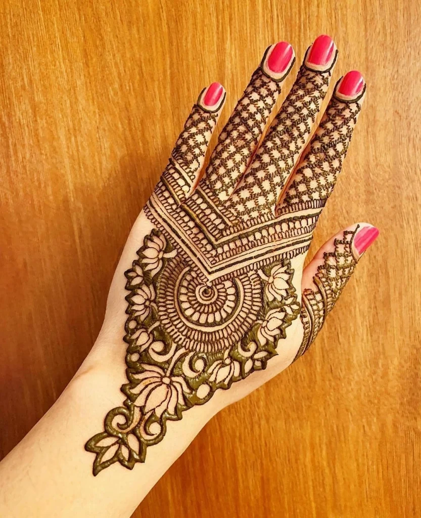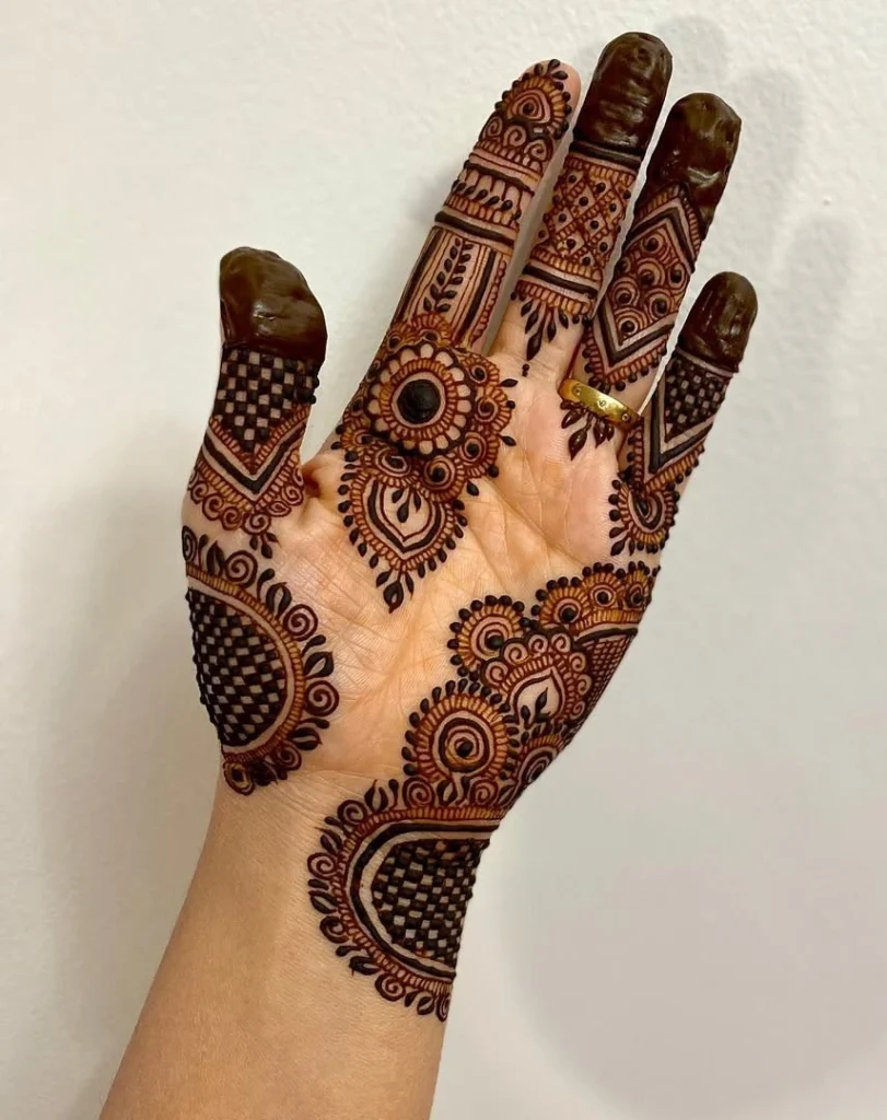 Rajasthani checks henna designs, or “chakri” designs, give a fresh look to classic mehndi patterns. They mainly show checkered or grid patterns, mixed with other traditional motifs to make them more interesting.