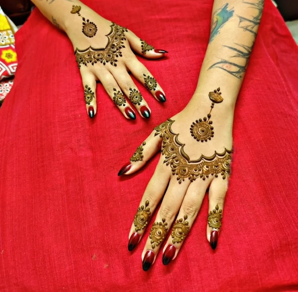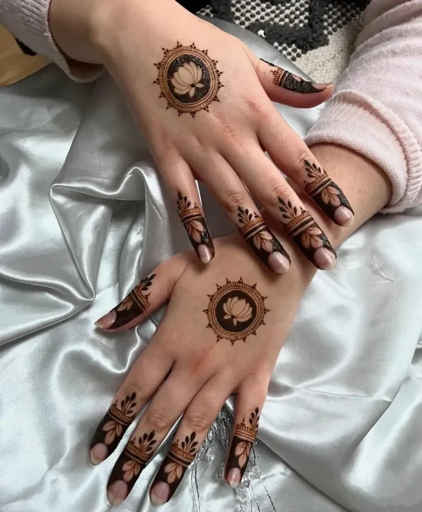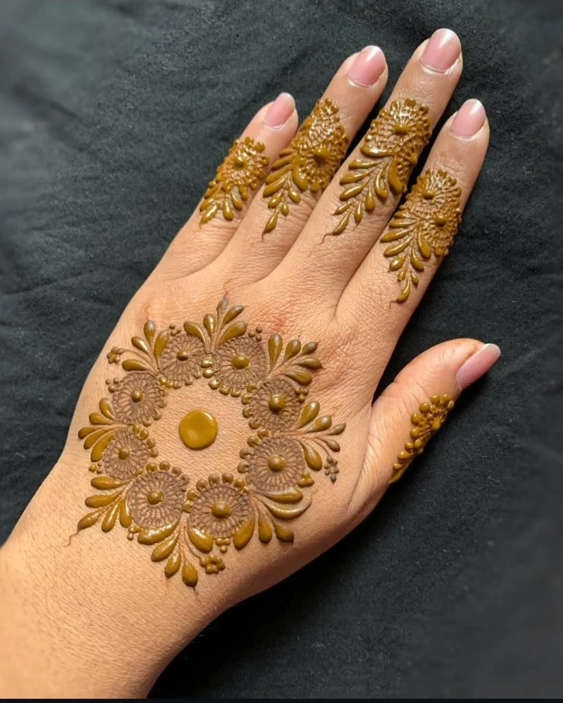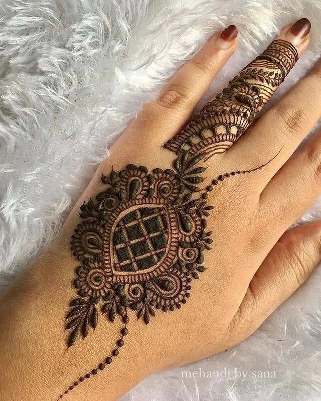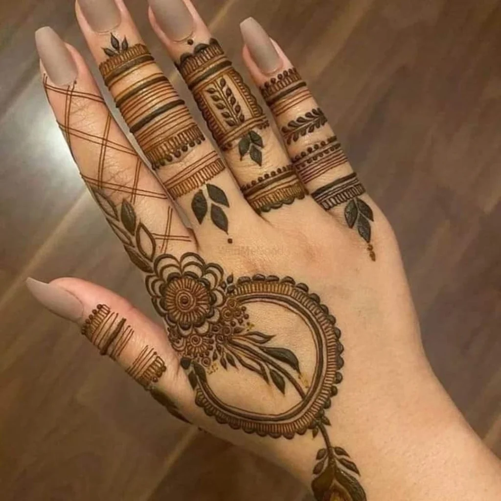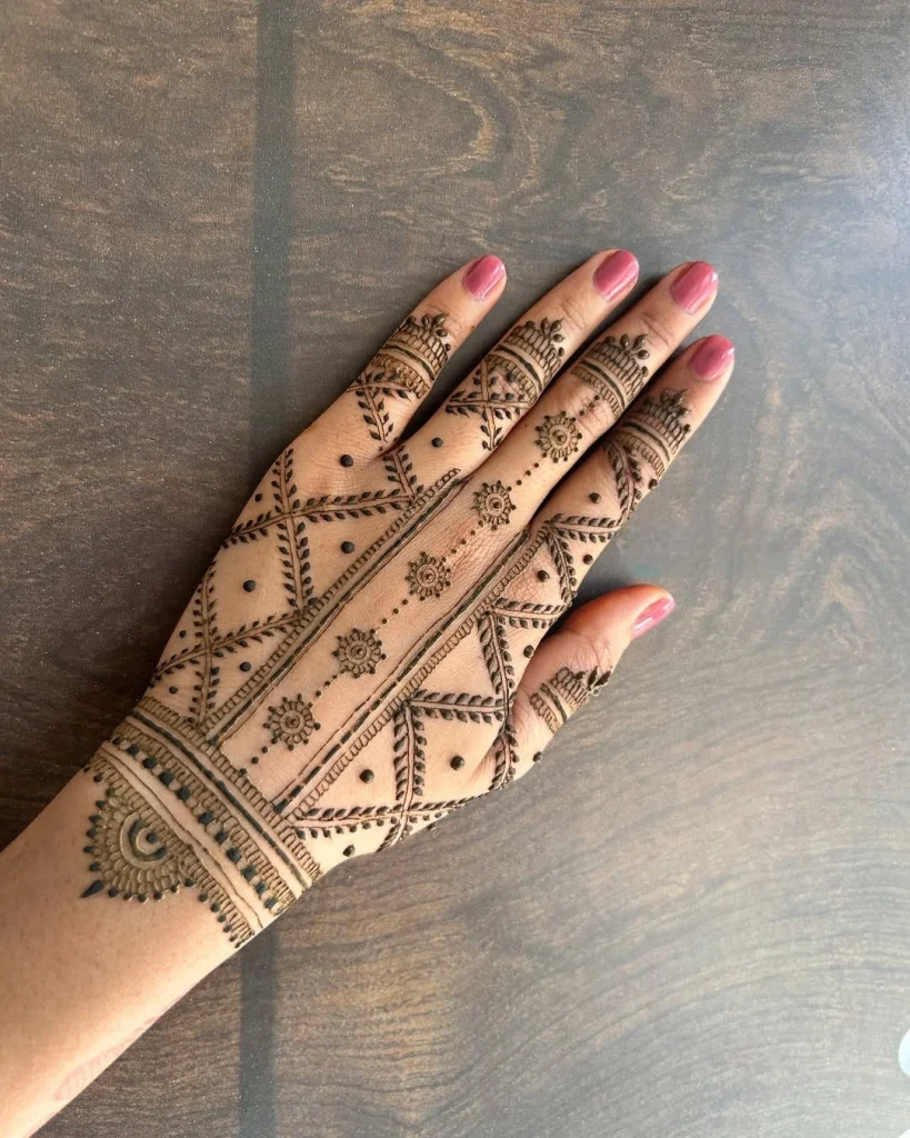 Brides love this idea because it combines simplicity with a modern twist. It works well for those who want contemporary touches in their traditional henna styles. You can pair these designs with other geometric elements on your palm or fingers for a complete, stylish mehndi look.