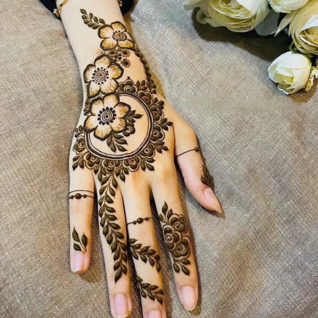 The tiny flower patterns gently wrap around the finger, reflecting a ring’s elegance. With thin lines and detailed leaves, this beautiful mehndi design is perfect for brides wanting a soft and tempting look. Adding small buds or swirls makes this design even more appealing.