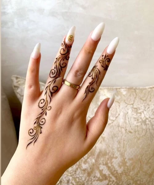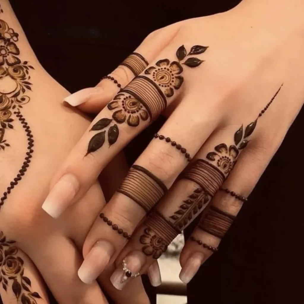 Popular finger mehndi designs for the ring finger include floral wraps, leaves, simple dots and lines, geometric shapes, and lace-like art. These mehndi designs are great for brides who want elegant and simple looks. They help make the ring finger stand out during special events.