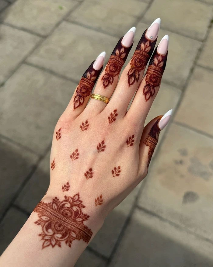 Starting your Mehndi journey can be fun and easy. Beginners should try simple designs like dots, leaves, and paisleys. The paisley pattern is a classic choice. It’s stylish and easy to do. You can mix it with dots and curved lines to fill your palms or fingers with beautiful designs. Adding little flowers in between can make your look unique. These designs are simple, which makes them great for celebrations like Raksha Bandhan.