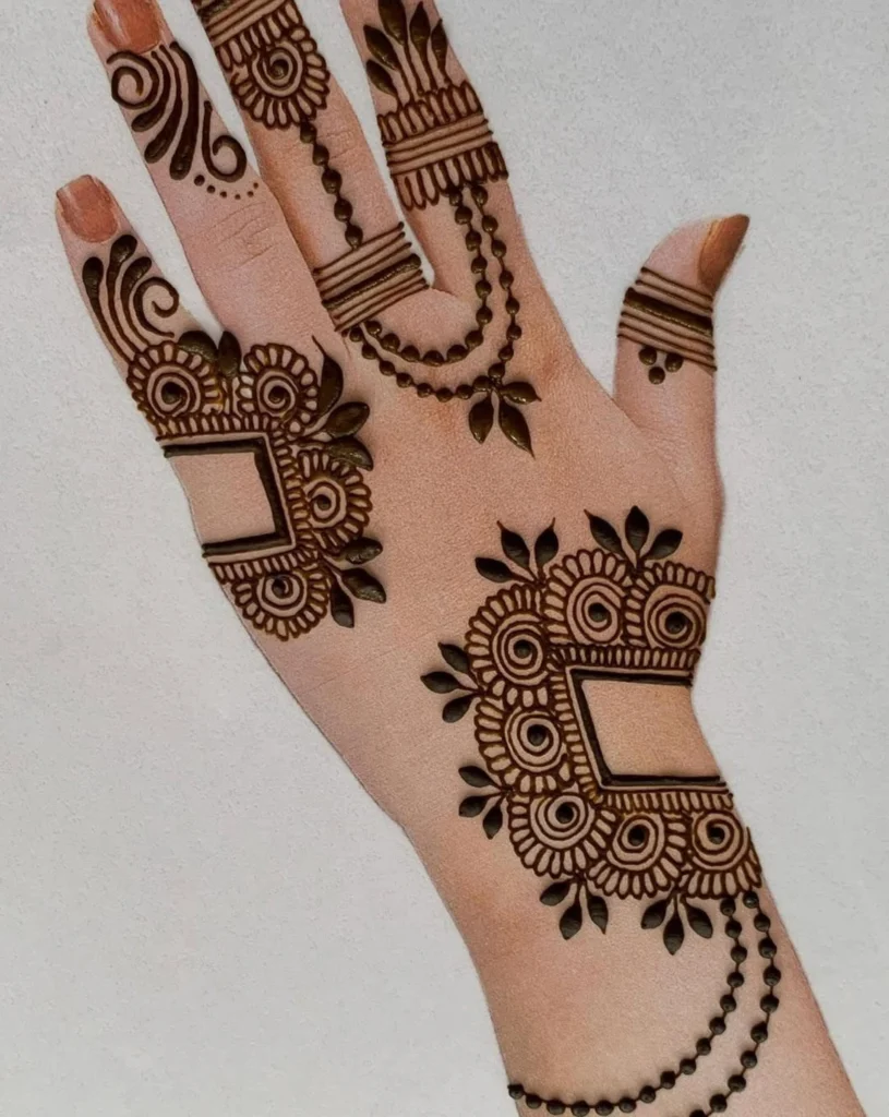 There are also fun styles like geometric shapes and bold mandalas. These designs mix tradition with modern style. Some cool options like groom caricatures or proposal themes add a personal touch to bridal mehendi. For a simpler look, minimal floral patterns and checkered designs work great. These trending mehndi designs, including festive picks like Raksha Bandhan mehndi designs, combine rich culture with creativity, leaving guests amazed by the skilled work displayed.