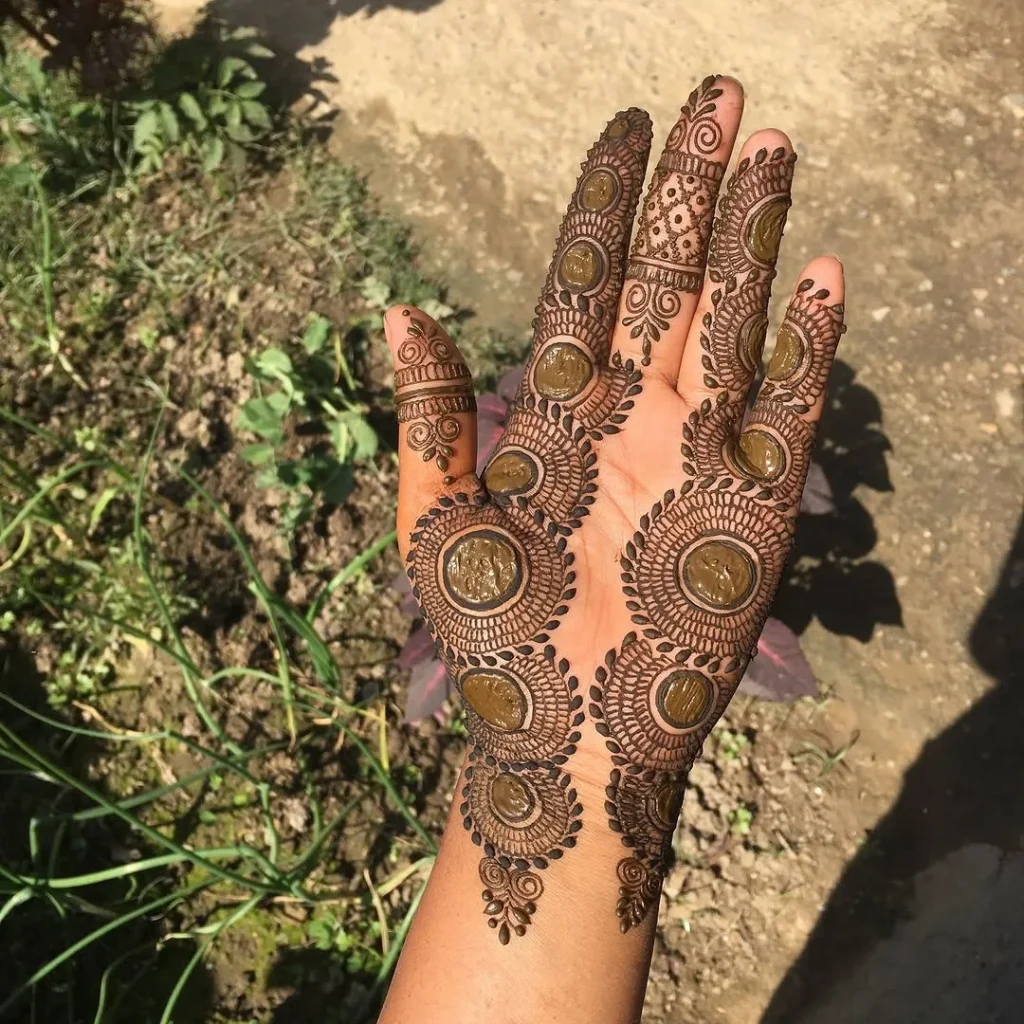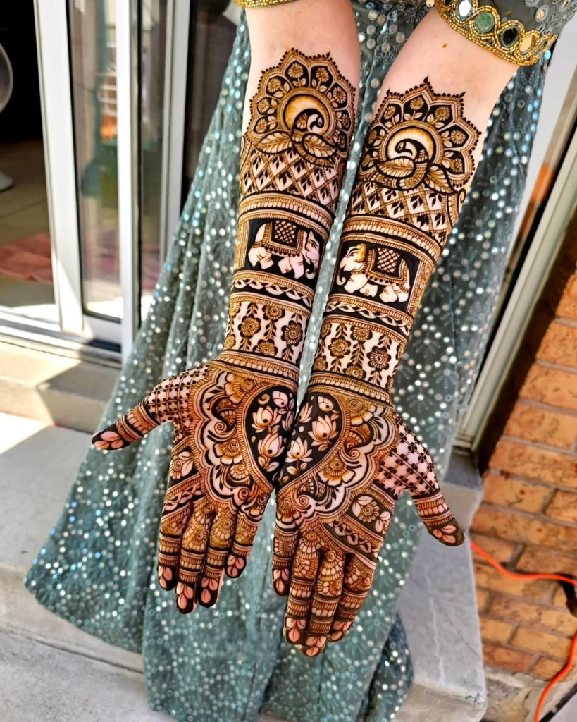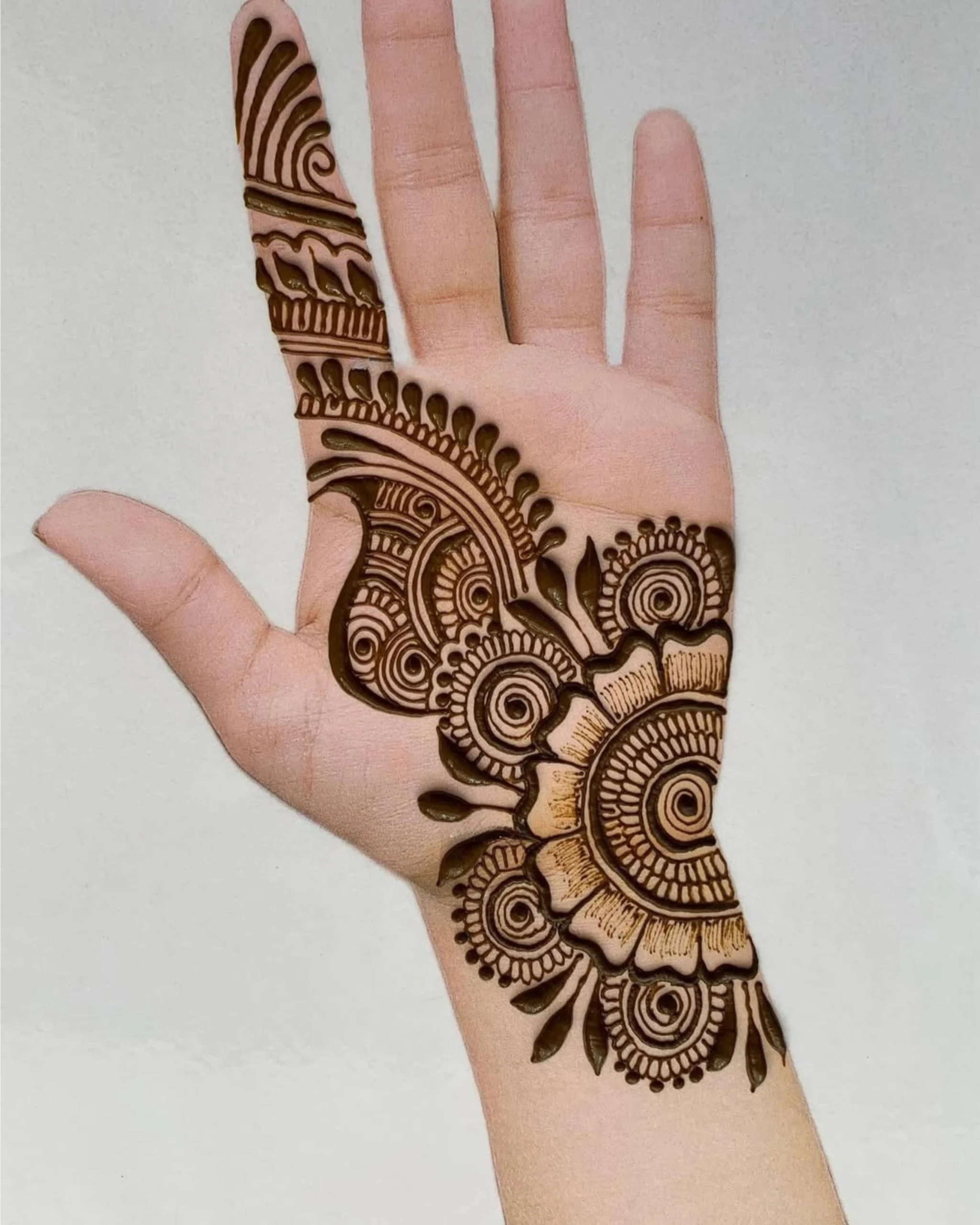 The art of mehndi has changed a lot, featuring fresh and unique designs. Floral patterns are still popular, often showing roses, daisies, or lotus motifs. These motifs stand for beauty and style that last through time. Pairing lotus patterns with lace glove designs gives a modern touch to traditional styles. Detailed designs like jaal work or parrot designs tell a story through mehndi. Circular patterns at the center of the palm add balance and beauty, easily drawing attention from others.